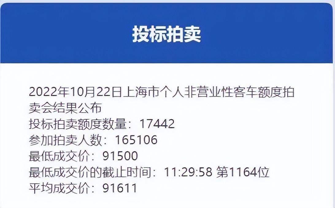 个人额度投放16100辆,个人在用车有效额度委托拍卖1342辆,合计拍卖总数17442辆,参加拍卖人数165106人,比上月减少了13507人,中标率10.6%。最低成交价91500元,平均成交价为91611元,比上个月92426元减少了815元。最低成交价的截止时间是11:29:58第1164位。你拍中了吗?